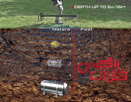- حداکثر عمق: نهایت عمق شناسایی این سیستم بسته به اندازه هدف و نوع خاک بسیار متفاوت است. برای اهداف بسیار بزرگ (مانند ۳۰x۳۰ سانتیمتر یا بزرگتر)، این سیستم میتواند به عمق حدودی ۳ تا 4 متر (معادل ۱۰ تا ۱۶ فوت) برسد.